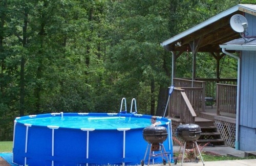 The Heights Lodge is a gorgeous home with a huge, fan-lit deck and picturesque views of the forest and Norfork Lake. This 1600 square foot, 4 bedroom, 2 1/2 bath home can accommodate 8 to 14 people. A beautifully kept home, it features handsome wood construction and a sportsman’s décor of bears, moose, fish, deer and eagles. The garage houses your own private game room with a pool table, foosball, darts and more. The paved driveway area has a basketball hoop and a campfire pit and horseshoes are located nearby. In the summer, an above ground pool adds to the excitement.
