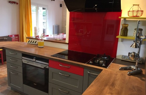 2019: the new kitchen year! entirely changed, keeping in mind also the access for disabled people. Coloured and modern, we added lot of cupboards. We increased the size of the landing bedroom for the bed to be more in privacy space, and we created a new WC on this first floor.