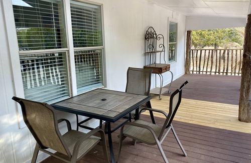 Casa Blanca is located between Ingram and Hunt, along the Guadalupe River, on 11 acres with multiple rentals. Guests have free access to 330' of Cypress-lined riverfront, which includes a deck extending over the river, rope swing, rock patio, and spacious lawn area. Recreational equipment and numerous outdoor meeting areas are available throughout the property. Free parking and Wi-Fi for all guests.