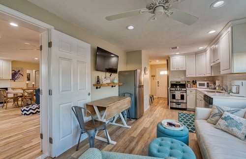 This is the perfect home if you are traveling with friends, grandparents or in need of a private workspace while others are at the beach. The north end of the home features a suite with it's own outside entrance as well as a passthrough within the house. The beach is located right across the street. Walk along the sidewalk to all of Cocoa Beach downtown local favorite spots. Simply Delicious Café hosts an array of incredible pastries, Heidi's Jazz Club and so much more. The Pink House offers 3 bedrooms- 2 bathrooms, and 2 kitchens-. Extremely spacious. The master suite features a sitting area with couch, kitchen, bathroom and bedroom with washer and dryer. Walking through the interior door brings you to the main side of the home. Here you will see a kitchen, dinning room table, sleeper sofa with smart TV, full bathroom and two bedrooms featuring vanities and smart tv's.