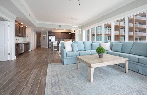 As soon as you enter this luxury corner unit, you’ll be wowed by stunning Gulf views through two walls of floor-to-ceiling windows and sliders. The free-flowing living space is designed with luxury wood-look tile flooring, soft blues and creams, and coastal chic decor. The huge, comfy sectional is ultra-inviting, with views of the beach and the enormous flatscreen TV, the perfect spot for movies, beach reads, and family game nights.