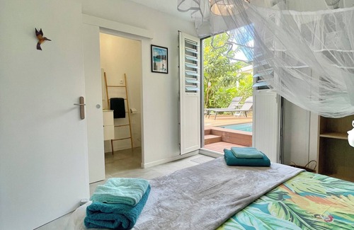 The lodge Douceur Tropicale is located on the heights of Sainte-Luce in Martinique, in a quiet residential area, just 3 minutes from the center and 5 minutes from the beaches. This lodge offers a cozy and comfortable atmosphere, with quality amenities for a vacation focused on comfort and tranquility. It includes a well-equipped kitchen, a comfortable living room, and a covered outdoor space ideal for meals and relaxation. The air-conditioned bedroom, decorated in a Caribbean style, has a bathroom with an Italian shower and toilet. Surrounded by flower beds with tropical plants, this lodge is a peaceful haven perfect for enjoying the gentle lifestyle of Martinique.