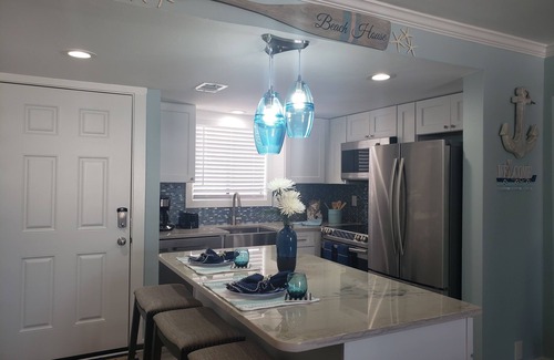 Recently renovated beachfront condo that is literally only steps away from the beach. Two beach chairs and one umbrella included from March 1st - October 31st. A large king size bed welcomes you to fall asleep to the sounds of the crashing waves or stream your favorite show on a brand new 55-inch smart tv.