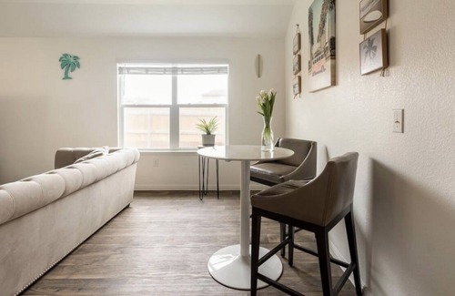 Relax at this centrally located oasis themed house newly built with one bedroom, one bathroom, a living room, kitchen, and backyard patio area. Enjoy a Queen sized bed with a memory foam mattress and an extra twin sized bed or sit back and watch a movie in the oasis themed living room with two sofas. Gather with friends or family on the outdoor patio featuring overhead lights. We assure you that you will love your stay at the Oasis!