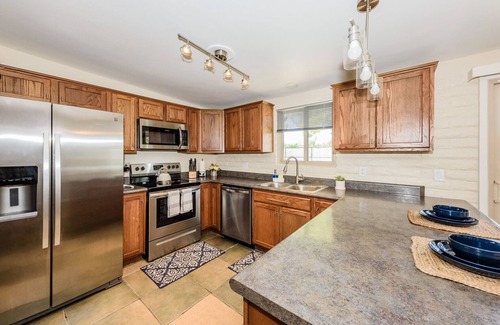 Relax with the whole family in this spacious, well appointed, quiet and private, four bedroom home in desirable Eastern Tucson, AZ. All bedrooms have smart tv's as well as the main living room for you to use your entertainment apps on WIFI. Home, baths and kitchen fully stocked, coffee tea & waffles. Laundry. Ample parking. Private back yard with a sparkling pool (NOT heated) Pool servicing is Weekly/bi-wkly, Thur/Fri from 8a-2p. BBQ, stand alone spa and seating area outside. Home offer three bedrooms and an office with futon in home. Cozy, large living room with additional seating. Fully equipped kitchen. Waffle, coffee and tea bar area. Full sized laundry in garage with soaps. All amenities in home and drinks are complimentary. Trash bins are located in alley, through gate in back yard fence, monitored by the city. Dogs only. No cats.