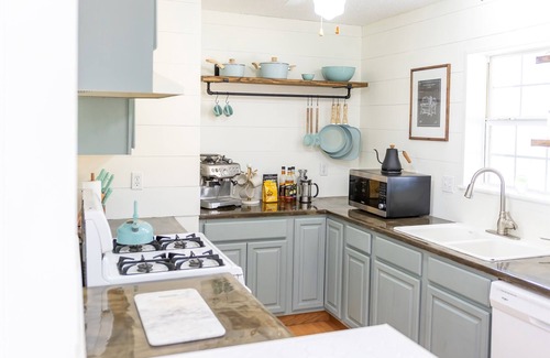 ☀ Full kitchen with gas stove, coffee bar, and kitchen island