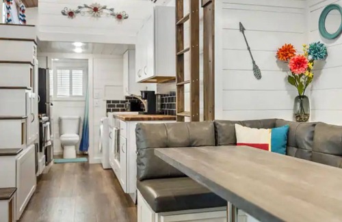 Whether trying out the Tiny House lifestyle, escaping the city lights, or just passing through, this modern gem, custom built by Tiny Idahomes, is the perfect getaway. Step inside to see the soaring ceilings, kitchen with dishwasher, full bathroom with shower, loft bedroom, and Flat-Screen TV. As the sun fades, trade Air-Conditioning for the relaxing open-air patio complete with shaded pergola and propane fire pit.