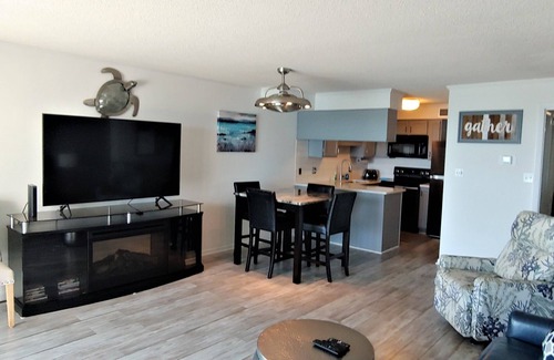 Beautiful contemporary 1 bedroom, 1 bath spacious condo perfect for honeymoon, anniversary or that romantic getaway. Keyless entry for guest convenience and no contact check in. The code is changed with each rental. Living room includes 65 inch Ultra High definition/ 4K premium smart TV, 4K Blu-ray player, private secure high speed WIFI for our guests, electric fireplace (for mood and/or heat), and opens to a balcony with spectacular views of the beach and ocean to enjoy beautiful sunsets. King size platform bed with 14 inch plush comfortable mattress and smart tv are included in the bedroom that has a stunning accent wall. Adjacent bathroom that includes shower and tub. The kitchen includes quality black stainless steel refrigerator/freezer (w/ ice maker) and stove/oven, beautiful quartz countertop, dishwasher, microwave, drip coffee maker and Keurig kcup coffee machine, and slow cooker.. Enjoy your home-cooked meals or delivery on the counter height dining table with chairs while taking in the amazing view. Stack washer and dryer in condo for your convenience. The balcony includes 2 counter top chairs with a table in between them and 2 cushioned chairs. Outdoor seasonal pool and plenty of lounge chairs. We have a beach closet that we provide our guests with chairs, umbrella, wagon, coolers, towels, etc. We provide guests with bath and bed linens. The property has parking on site and across the street. There are 2 elevators with security codes located on the property Convenient location that is 5 blocks to Main Street with restaurants, bars, stores and more. We encourage all guests to purchase trip insurance in the event of an unexpected emergency. We are unable to refund or reschedule past the cancellation policy.