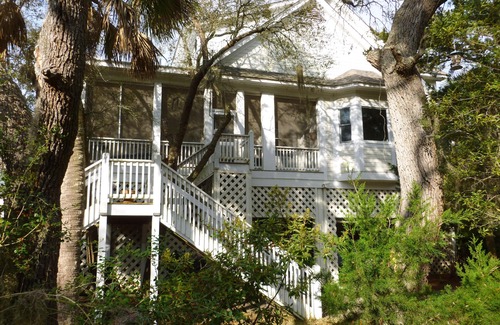 This is your ideal vacation home. On deep water and also overlooking the ocean. The spacious living room has a large fireplace, wet bar with ice maker, and is open to the dining room and kitchen. This all overlooks a beautiful expanse of a deep water creek and marsh and then also the ocean. The porch runs the length of the house and is furnished with comfortable Lowcountry wicker. Whether you enjoy a cup of coffee or an evening cocktail, you will never want to leave this porch! Through large French doors, the dining room and well-stocked kitchen are ready to cook for you and your crowd. The master bedroom is downstairs with an en-suite bath and jacuzzi garden tub. French doors in the master open to the wonderful porch and hammock. There is plenty of space for families and kids to spread out in the upstairs second den/playroom, equipped with TV and a full size piano. Six additional bedrooms will surely accommodate you and your friends. A second bedroom with en-suite bath is located downstairs. Upstairs are 5 BR, 2 full baths, accessible to all, and 2 half baths located inside each king BR for privacy. After a day on the water, the convenient half bath and two showers under the house make for convenient living. A kayak paddle up the creek or a 5 minute drive will take you to the ocean for swimming and some of the best shelling around. The house has bikes and kayaks for rent. The house has both a gas and charcoal grill there for your pleasure and an oyster steamer as well. This house is located in a private neighborhood gated community. Wonderful for biking and nature walks with family and friends. Note: there is a limit of four vehicles. There will also be a fine assessed if you do not follow the garbage policy. ALL GARBAGE TO BE BAGGED IN INDIVIDUAL TRASH BAGS AND NOT LEAKING. ALSO THIS IS A STRICT NO PET/NO PARTY PROPERTY