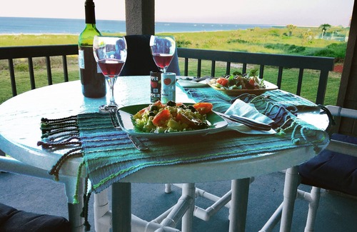 After a day of sightseeing enjoy the ocean rhythms from your private 2nd-floor deck or take beach chairs right to the sand. The back deck overlooks the building’s tennis court and swimming pool and also provides a peek at the sunset over the marsh. The condo sleeps 4 and is fully furnished with ceramic tile throughout, plantation shutters, granite countertops, and new kitchen appliances.