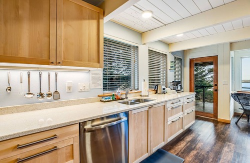 Come to Cape Meares and make this spacious rental your home away from home on the Oregon Coast. Revel in beautiful ocean and lake views and easy access to the beach. Great for families and multiple couples, this home also offers plenty to keep you occupied when you want to stay in and enjoy each other's company - a hot tub, Tempurpedic mattresses, and recently renovated bathrooms all combine to create the ultimate in relaxation. Both bathrooms now feature updated, brushed-nickel finishes and new LED lighting. The main bedroom’s en suite bathroom now features a spacious shower with safety grab bars and a teak seat, as well as a dual vanity. The guest bath on the main level now features a 36-inch wide bathtub and shower, also with safety grab bars, and a single vanity cabinet.