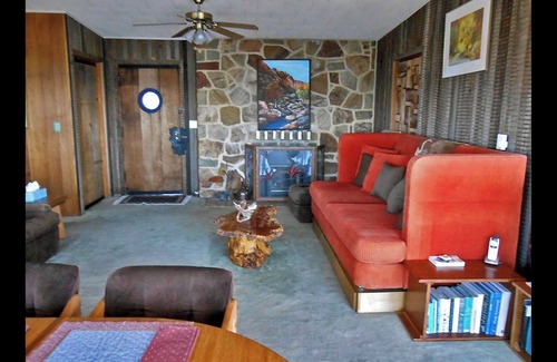 This two story charming retro family home is located fifty feet directly above the crashing surf. With a 180˚ unobstructed view, each room has its own perspective of the ocean. The property has its own “island” in front of the house. Ocean’s Edge offers great privacy while located near town. Built in the 1960’s, this eclectic home is 1,700 square feet featuring 3 bedrooms, 2 baths. The cabin sleeps six with extra beds for eight. Complete with a spa room, a sunken whirlpool tub and spectacular ocean views. It is perched on a cliff which makes it easy to spot the seasonal migration of whales. There are a myriad of shore, sea and wading birds or raptors making a stop in the trees on the “island” in front of the house. Many sea stacks dot the ocean. While there is no beach access from the property, within a short walking distance from the house, Pebble Beach may be reached. Winter stays at Ocean’s Edge can bring the northern Pacific’s dramatic winter storms with the surf pounding the beach and rocks below.