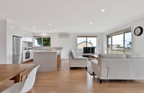 A very inviting open plan family, dining table for 8 people, kitchen space including a dishwasher, microwave, pantry, electric cooktop and oven, fridge, coffee machine, tv and cosy lounges. There are sea views from all of the windows across the front or on the full-length balcony of the home.