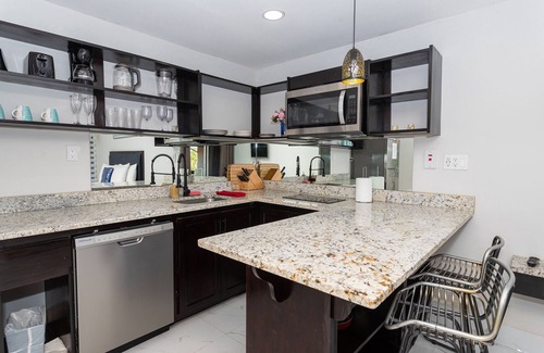 ● Fully equipped kitchen with breakfast place and granite counter-tops, plus Dishwasher, Over-the-Range Microwave, Cooktop, and Fridge