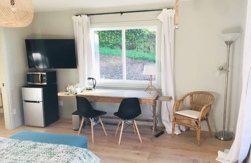 You will have your own entrance to the suite, which has a queen bed, its own full bathroom with bathtub and shower head, a desk, Wi-Fi, smart TV, mini-fridge, microwave, an electric kettle and a French press for tea or coffee, a closet with an iron and ironing board, a hair dryer, a first-aid kit and all the bedding and bathroom supplies you'll need. There are extra glasses and chairs for reading or having people over.