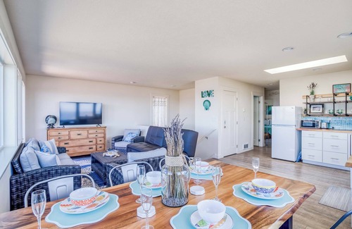 Climb the stairs to your very own Octopus Den, an upper-level beauty in Newport with glorious views of the Pacific. This guest house gives you all you’ll need for a great stay in a coastal city rich with activity and natural beauty, whether you plan a trip to the Oregon Coast Aquarium, the bustling shops of the historic bayfront, delicious seafood from the fleet of fishing boats in the marina, or time on its spacious, flat sand beaches mere blocks from your home away from home. Contemporary furnishings, including sleek sofas in the living room and fresh bedding in the two bedrooms, open space, and new flooring promise an uplifting, inspiring stay. Large windows let in ocean light, and the upper deck gives you a wonderful spot to enjoy views, breezes, and magnificent sunsets to end your day. An open, fully equipped kitchen gives you the option to eat in, or you can walk to several dining spots, including the oceanfront Georgie’s in a nearby hotel, or several options in the Nye Beach area. Downstairs, you will find a relaxing hot tub and a partially fenced yard. The Newport Performing Arts Center is just a few blocks away, so you can time your visit to live music, art, drama, or a Newport Symphony performance.