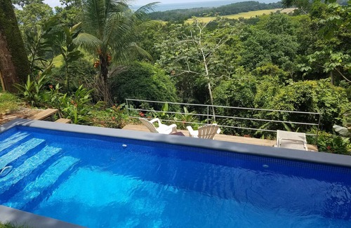 This private villa is a coastal mountain retreat overlooking the Pacific Ocean with panoramic and white water views and gorgeous nightly sunsets. A short 5 minute drive takes you to the surfer village of Dominical.
