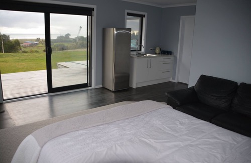 This studio apartment is situated on a sunny hillside and has the perfect view of the ocean waves nearby. It is close to town (5 minute drive away) and yet has a relaxing country outlook. The apartment is new and modern and has all that is needed for a cozy stay. It has plenty of space for living and has an easy indoor-outdoor flow with a private deck outside with outdoor furniture ready to be used. The apartment is ajoined to a house.