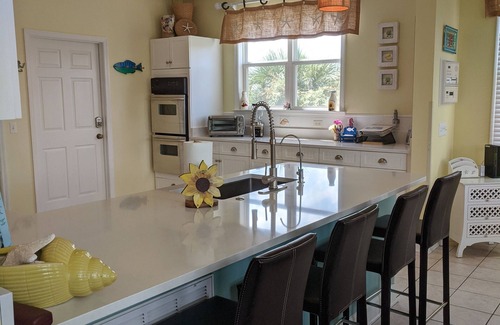 - Create amazing meals while smelling and hearing the ocean through the large windows in the kitchen. Kitchen is well-equipped with stainless double ovens, lots of counter space, French door refrigerator and an extra mini refrigerator for added grocery storage!