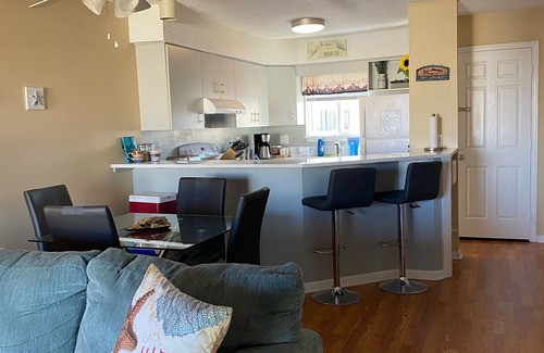 This unit boasts updated patio furniture, windows, door, queen size mattress for the master bedroom, living room furniture, and renovations to the kitchen and both bathrooms . Cable on 2 smart flat screen TVs with DVR in the living room, NetFlix with other apps at the ready, a Roku supported TV in the guest bedroom, and free WiFi included for our valued guests. Dine in and enjoy the nicely stocked kitchen with dishes, cookware, utensils, spices, pots and pans, microwave, coffee maker, blender and toaster, or walk to one of many local restaurants if dining out is your pleasure.