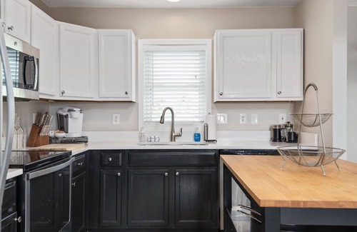 The kitchen is fully equipped with stainless steel refrigerator, oven, microwave, dishwasher, and all dishes/cookware.
