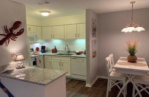 Our bright and cheerful ground-floor unit has one bedroom, one bath, and a fully equipped kitchen. The condo has been fully remodeled for your enjoyment. The comfortable furniture in the living area includes a sleeper-sofa, and the king-sized bedroom suite with a top of the line mattress will ensure a restful night. The bathroom includes a beautiful step-in shower, granite topped vanity, and all new tile. Also included is your own private wi-fi.