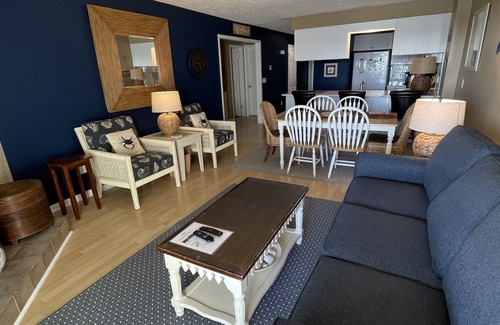 Relax, Refresh, Repeat. Do you want the comforts of home while vacationing? Would you like to relax out on a deck watching miles of spectacular oceanfront views with amazing sunrises and its images reflecting on the Atlantic? Would you like to be lulled to sleep listening to the waves in the oceanfront Master bedroom? Having rented many condos/cabins/apartments in the past, and with you, the guest in mind, I have chosen the look, feel and amenities that will give you a memorable vacation. Linens and towels included with every stay. Handmade afghans are provided for those cool nights on the deck. Our home away from home is decorated tastefully with plenty of room for your things. My “Big Book of Everything” is chock full of information to help navigate your day. Chairs and toys for the beach and games and books are for your enjoyment and convenience. Three bedrooms, all with t.v.’s and none sharing a wall ensuring privacy. There is a pull out queen sofa in the living room that has a 50" t.v. too. My condo is on the 1st floor; there are 12 stairs to get to my front door. Also, my covered deck is shady in the afternoons for your enjoyment on those hot days.
