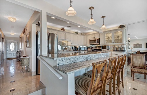 UNIT #6 is beautifully decorated with TOP-OF-THE LINE MATERIALS, FURNISHINGS, ORIGINAL ART WORK AND ACCESSORIES, including all new state-of-the-art stainless steel kitchen appliances (including a 30 cubic foot french door refrigerator with a water and ice dispenser, a full size oven and stove, a dish washer and a microwave oven), custom kitchen cabinets with slow-close drawers and accent lighting above, below, and in, such kitchen cabinets, custom bathroom cabinets and mirrors, granite counter tops throughout, several Schonbeck crystal light fixtures, three Kholer Devonshire toilettes, a new air conditioner, a new 80-gallon hot water heater, two top-of-the-line Wesley Allen king-sized wrought iron beds in each of two bedrooms, one top-of-the-line Wesley Allen queen-sized wrought iron bed in a third bedroom, along with one set of wood “full over full” bunk beds, a dining room table having comfortable seating for 8 or more, and an island that can comfortably seat at least 4 more on bar stools with backs, crown molding, porcelain tile (with a marble look) throughout, very comfortable, leather furniture (a large sectional and two additional chairs). The granite counter tops in Unit #6 are a Level 2 grade (higher grade than normal), and the light porcelain tile floors, which include "drop ins," has a look of marble.