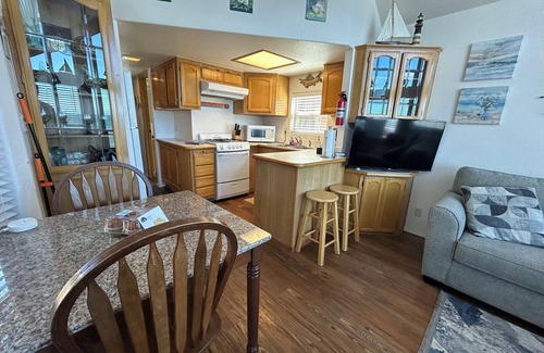 Our cabin is fully equipped with everything you need to feel right at home. A spacious and comfy living room and dining area overlooking the ocean, a fully equipped kitchen, a downstairs master bedroom with a queen bed, bathroom with shower and bathtub and upstairs NON-STANDING loft with two twin beds . Please note the stairs are a bit steep.