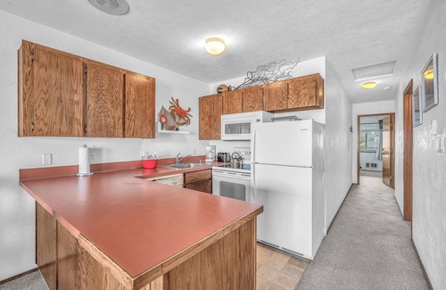 This bright and cozy condo has an open living area ideal for relaxing and gathering with a comfortable sofa, flatscreen TV, a fully equipped kitchen, and dining table that seats 4.