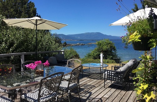 This lovely west facing ocean side home commands spectacular views of the ocean. Meander down a few steps to the warmest swimming beach on Salt Spring. Enjoy spectacular sunsets from the large deck. This home sits on a 1/2 acre surrounded by a mature apple orchard, providing total privacy. There are three bedrooms, two bathrooms, fully equipped kitchen, separate dining room, living room with wood burning fireplace and french doors that open onto a large deck, washer/dryer, all bedding and towels supplied.
