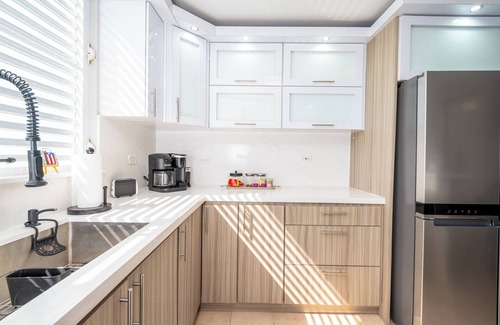 **Fully Equipped Kitchen:** Prepare delicious meals in the modern kitchen, featuring stainless steel appliances, quartz countertops, and all the essentials you need for a home-cooked experience.