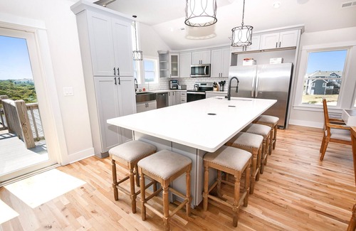 Top Level: Great room with flat-screen TV, electric fireplace, desk, oceanfront deck access with ocean views and outside dining table. Kitchen with 2 ovens, 2 dishwashers, beverage cooler, 2 refrigerators, island with prep sink, counter seating for 6 and deck access. Dining area with 3 tables seating 20+, half bath, and 2 King Master Bedrooms each with flat-screen TV, private bathrooms and deck access.
