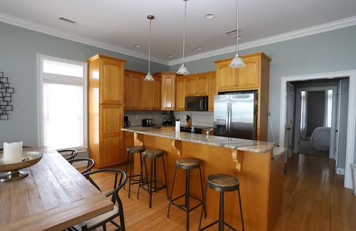 While this home has “location, location, location”, the real benefit is the quality of the home itself. The first thing that you will notice is the quality of the construction. The home features porcelain tile and bamboo hardwood throughout, heavy trim work and 10 ft ceilings. The quality construction also includes heavy insulation, so you will immediately be impressed by how quiet the home is (important when you are vacationing with a large group). Each of the 4 main bedrooms is a master (having its own private full bathroom attached). Three of the 4 main bedrooms feature beautiful King size beds with super comfortable mattresses and the 4th bedroom features a two custom built bunk beds: 1 twin XL over Queen and one twin over twin. These beeds have 45inches of head space between the bunks so you don't feel like you are in a bunk bed. The fifth bedroom is on the entry level and has a twin over full bunk to help accommodate the overflow when unexpected additional guests show up (because you know when you have a wonderful place at the beach ….it will happen!). Note that this room does not have a private bathroom, but your guest will find it far superior to a sofa sleeper alternative for your overflow that is offered in many other homes!!) Everyone will appreciate the elevator to move luggage, food and family between floors.