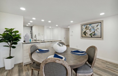 Step through the front door and immediately into the heart of the home — a sleek, fully updated kitchen where bright cabinetry, beautiful granite countertops, and stainless steel appliances create an effortlessly functional space. Whether you're crafting a morning smoothie or a candlelit dinner, this well-equipped kitchen has everything you need for a seamless stay.