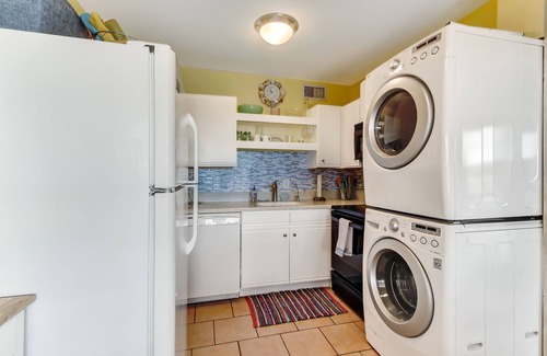 Just down the hall sits the master bedroom boasting a king size bed complete with a wicker headboard, beautiful floral comforter, coastal bamboo chiffonier and flat screen smart TV. The guest bedroom offers a large twin over double white wooden bunk bed, white chest of drawers and flat screen smart TV. Across the hall you will find the shared bathroom decorated with coastal blues and whites and complete with granite countertops and a shower/tub combo.