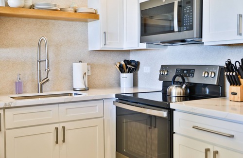 After a day at the beach, you will enjoy the custom designed bedroom complete with a king bed. Leave the custom barn door open to hear the ocean or close it for privacy. The fully stocked kitchen features brand-new stainless-steel appliances, quartz countertops, and a breakfast bar. Not a detail has been overlooked! The living area includes a memory-foam, comfortable pull-out sofa facing your 55” Smart TV.