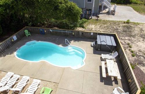 Extras: Private Pool (14 x 32), Hot Tub, 4 TVs, 1 VCR, 3 DVD players, high-speed wireless internet, stereo, book library, parking for 6 vehicles, outside shower, picnic table, cornhole, beach chairs, beach cart, gas & charcoal grills, wood fireplace, screened porch, wet bar and linens and towels provided. No Smoking. No Pets. Full week rentals only. Distance to beach access: 700'. House Address: 1205 Coral Lane. Beds: 3 Queens, 2 Bunk Sets. Key Type: Keyless Entry. CHECK IN LOCATION: 1023 Ocean Trail, Corolla Office.
