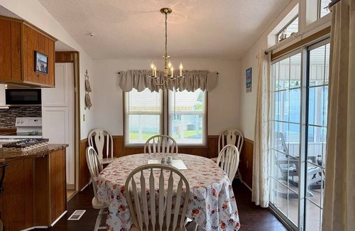 Stay comfortably in Surfside Beach in Oceanside village in our gated community at this 2-bedroom, 2-bath mobile home. This brilliant property features 1 king bed, 1 queen bed, and 1 twin bed, perfect for a family or group of friends. Enjoy the enchanting living room with a cozy futon for extra sleeping space. With amenities like AC, a fitness room, splash pad, bocce ball, basket ball, indoor and outdoor pools, and more, guests will have an amazing stay. Make your holiday one for the books with a stay at our place. Complementary golf cart for use throughout the village and to and from our private beach parking entrance for our community.