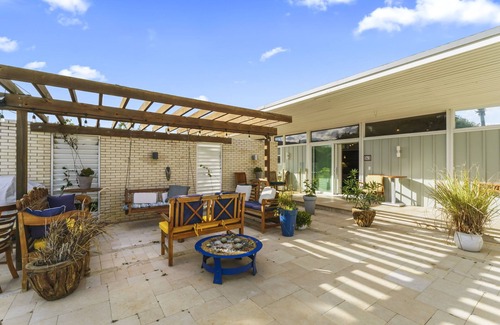 Spend a season at the Coastal Cove, a spacious studio at The Atlantic Beach Estate, which overlooks the 1200 square foot oceanfront swimming pool. The unit has 800 square feet of living space with an open-concept floor plan, with a long bar which is perfect for hosting friends and family. The Coastal Cove features a spacious sitting and dining area, with leather couch, teak roll top desk, queen bed and spacious bathroom. Lounge on the beautiful teak furniture around the oceanfront pool that is lighted at night and glistens in the moonlight. The 1.7 acre estate property sits on a beautiful stretch of white sandy beach at the north end of Atlantic Beach. The Estate was designed in 1961 in a mid-century modern architectural design, featuring inverted California redwood ceilings that overhang the house which allows the doors and windows to be open when raining, travertine, teak, with glass and light throughout. The Estate has an expansive lush oceanfront lawn with a natural dune system leading to the ocean.