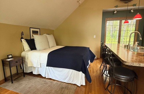 North Lake Leelanau (approximately 20 minutes northwest of Traverse City, Michigan). Upper-level carriage house is accessed via private road, in a park-like setting and is within 50’ of hard, sandy bottom North Lake Leelanau. Be our guest on our lake front lot (over 100’). We are hosts who make sure your stay is very enjoyable. Has an open floor plan that is beautifully decorated, with fully equipped kitchen, full bathroom, living room, and queen bed - brand new comfortable high-end mattress, air conditioning, and immaculately clean. Bed linens and towels are provided. Perfect accommodations for two people. Great romantic getaway or honeymoon cottage. So many great restaurants, wineries, coffee shops, brewery, hiking/walking, biking, sightseeing, fishing charters, and casino. Everything is here!