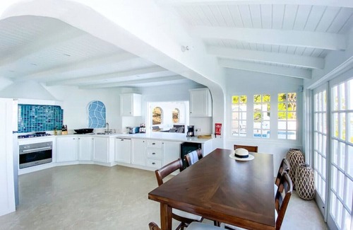 The fully equipped kitchen features a gas range, an oven, 2 refrigerators, a dishwasher, a wine cooler, and a microwave oven. All stainless steel. This allows you to cook for yourself, or hire a private chef to prepare a delicious Caribbean meal.