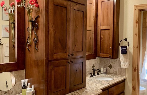 This is an unfussy luxury “mountain lodge." This home is decorated with a large stone fireplace; timber trusses; exquisite wall art; elk and acorn fixtures and lamps; professional dog photos, fine western iron-work; leather, cow hide mirrors & dressers; hand-hewn aspen tables and Adirondack chairs on the expansive upstairs deck.