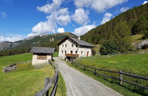 On the sun-terrace of Lü, uniquely located in its own off the beaten path location that gives you privacy and serenity with beautiful views of the surrounding meadows and across the valley (1500 feet above the valley floor). Ideal for summer and winter sports. Summer: Hiking, mountain biking, or simply enjoying the amazing views and the aromatic fragrance of the Swiss pines (pinus cembra).