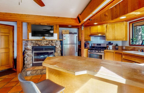 Walking into your stay, you'll instantly feel welcomed by the warm wood and stone finishes. A well-equipped kitchen in the central area offers the perfect space to whip up delicious dinners using the stainless steel appliances while visiting with your loved ones. Cozy up on the leather seating in the living area around the heat of the electric fireplace.