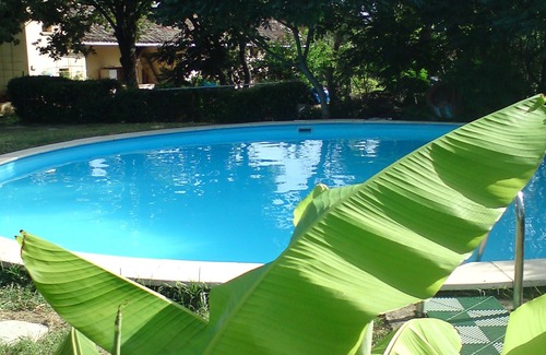 A round swimming pool (8m in diameter, 70 m3) and a barbecue are located in an enclosed space near the cottage in a green setting.