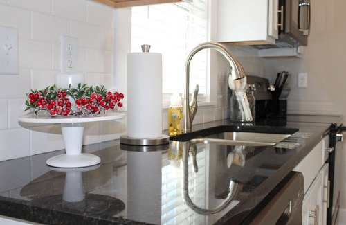 Guests will have access to the entire house, except the basement. The spacious great room provides comfortable seating to socialize, watch the 55” TV over the fireplace or sit around the farmhouse kitchen table and enjoy a meal or sip coffee or hot cocoa. A queen size bed completes each of the 2 bedrooms, along with a closet, 40” TV, dresser and a comfy chair. The house sleeps 4 comfortably with an additional adult or 2 children on the sofa pullout for total of 6. The 2 bathrooms are each stocked with plush towel sets (6 total sets), a hair dryer, toilet paper, tissues & starter toiletries (shampoo, conditioner, lotion). The washer & dryer are available should you need to launder clothes, a small supply of laundry detergent is provided. The kitchen is fully stocked for your cooking needs, complete with new appliances. A keurig is provided, along with several coffee k-cups, creamer & sugar. Finally, the front and back porch you will find cushioned chairs & lighting for your outdoor pleasure. There are no stairs inside the home, however, there are 4 steps from the driveway to the front porch to enter the home.