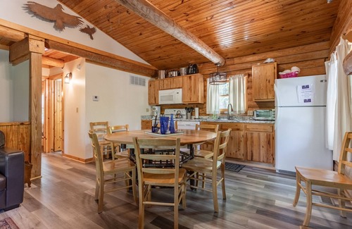 Old Hickory #7 is a great cabin for a large family or group. This cabin has an open concept kitchen, dining and living space with a wood burning fireplace and ceiling fan. On the main floor is a king bedroom, a queen bedroom and a hall bathroom. In the basement are 2 bedrooms with 2 queen beds in each and a hall bathroom. The cabin is situated close to the playground, so the little ones can have fun and adults can sit near by and watch. As the sun goes down, get ready to see more stars than you can imagine and hear owls and critters walking through the woods. You may even get to see a deer or raccoon if you keep an eye out! Listen closely to the beautiful sound of the whip-poor-will as you sit around the fire pit or on the porch swing. Come relax and enjoy! Need more beds, Cabin #5 is in close and easily sleeps 10.