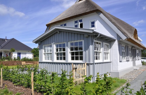 The Käptn's Half is a holiday home half in the pipe roof house "Alter Katen Glowe". Just 200 meters from the cliff edge and 1,000 meters from the beautiful sandy beach of the Schaabe. The house is newly built but romantic as in the time of Uroma, without sacrificing modern living comfort. Many details outside and inside according to old models. Wooden beamed ceiling, clay tiles, solid wood flooring, bakelite switch, sauna, fireplace and country house kitchen in the house for a cosiness and atmosphere. Breakfast is served in the conservatory with practical sliding windows. Underfloor heating, modern kitchen appliances, washing machine, Wi-Fi and magenta TV provide modern conveniences. Special consideration was given to families with children. There is a child safety gate on the stairs, the sockets have child safety and there is a Tripp-Trapp and a cot available.