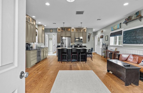 The Schoolhouse has two bedrooms and one bathroom equipped with a Whirlpool tub. The master bedroom has a king size bed fitted with a luxurious ten inch foam mattress. A wall-mounted 32' LED TV complete with cable access will help insure a relaxing finish to your day. The second bedroom is outfitted twin bunk-beds and a 26' LED TV to accommodate friends or family. WI-FI is provided free of charge for those of you who like to stay in touch while you are on vacation. A high-efficiency laundry system is available if you plan on an extended stay.